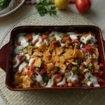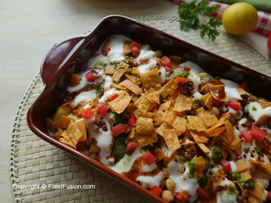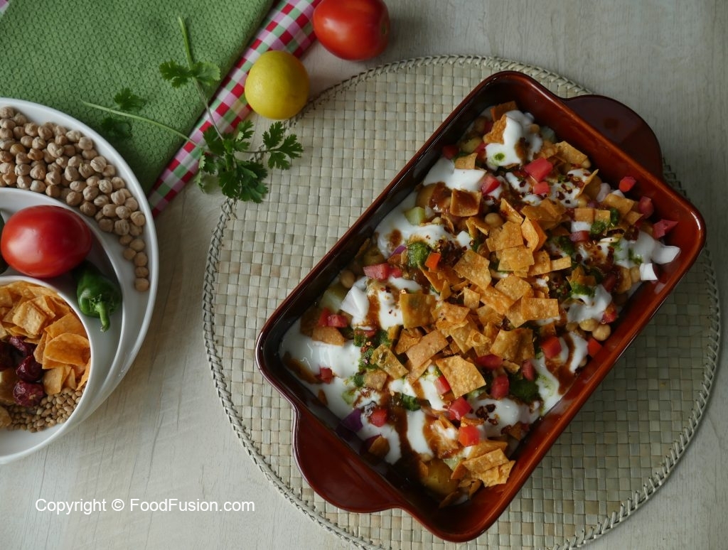 In serving dish,add yogurt,phulkiyan,red chilli crushed,chaat masala,potato,chickpeas,tomato,onion, meethi chutney,green chutney,papri,yogurt,meethi chutney,green chutney,red chilli crushed,tomato, papri & serve!