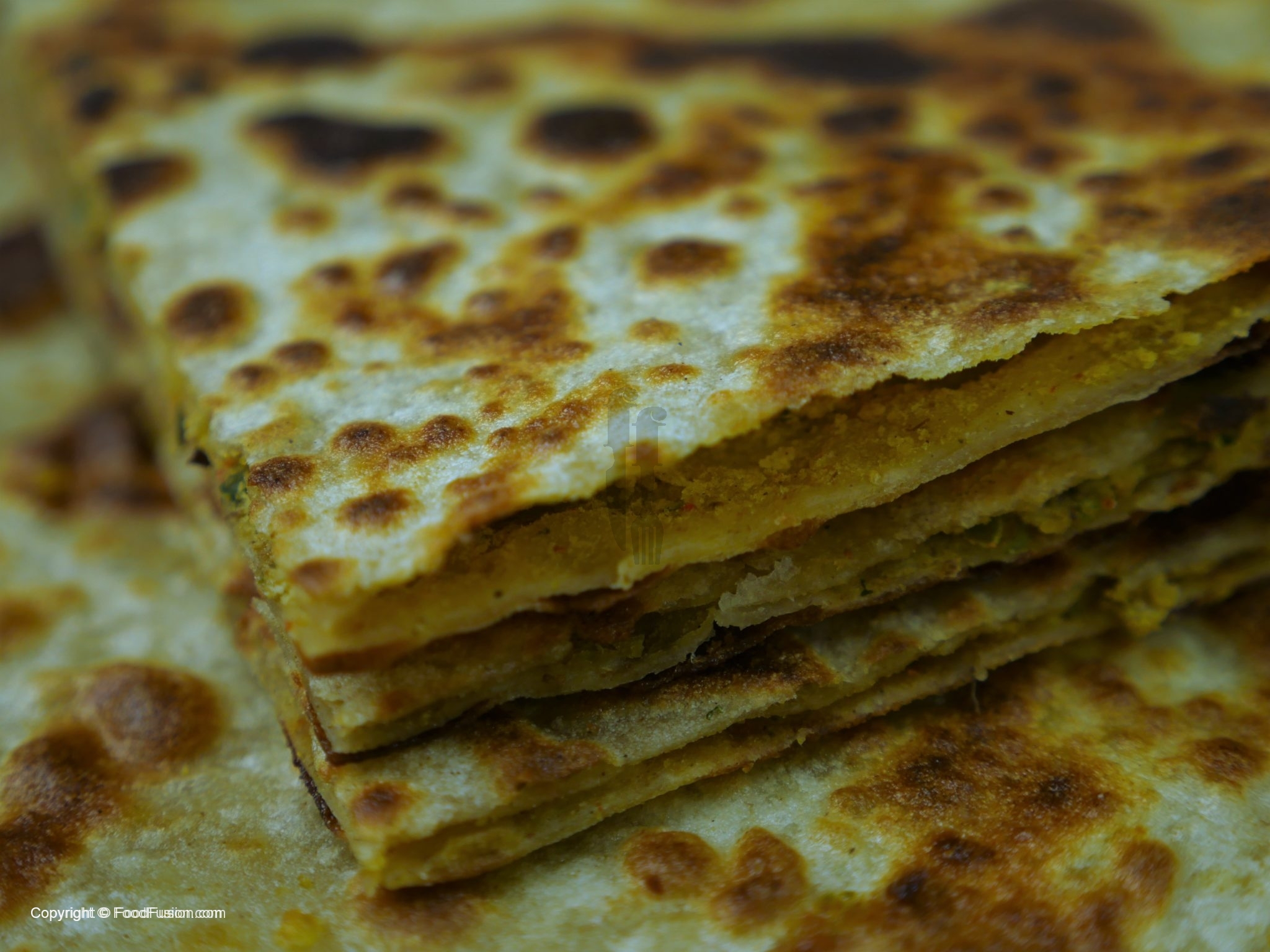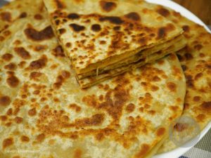 Dough ki small balls bana lein,dough ko haath ki madad sa pheela lein aur filling rakh ker upper sa dosra dough rakh dein,edges ko press ker lein,atta mein dust ker ka rolling pin ki madad sa bail lein.