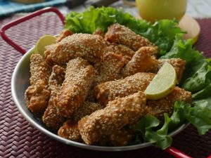 Add egg,all-purpose flour,cornflour,chicken powder,sesame seeds,vinegar & mix well.
