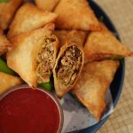 -Take samosa sheet & make pocket,add chicken stuffing in the center,stuffed green chilli,roll into the shape of samosa & seal corners with flour slurry (makes 16-18).