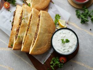 -Serve Hawawshi with prepared yogurt sauce!