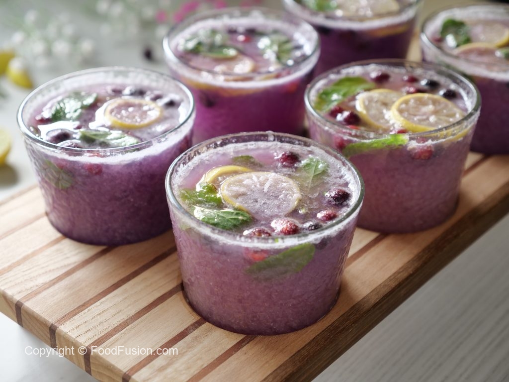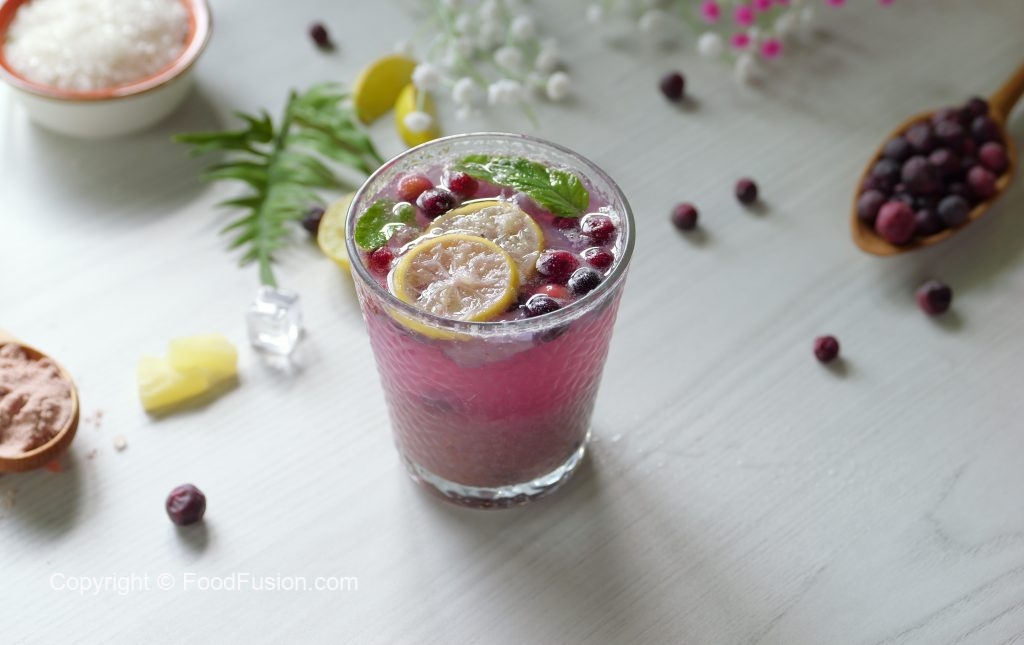 -Serving glass mein lemon slices,pineapple chunks aur podian dal ker muddle ker lein.