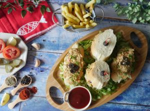 French bread per iceberg,tayyar fish filling,black olive aur hara pyaz leaves dal ker serve karein (makes 8-10).