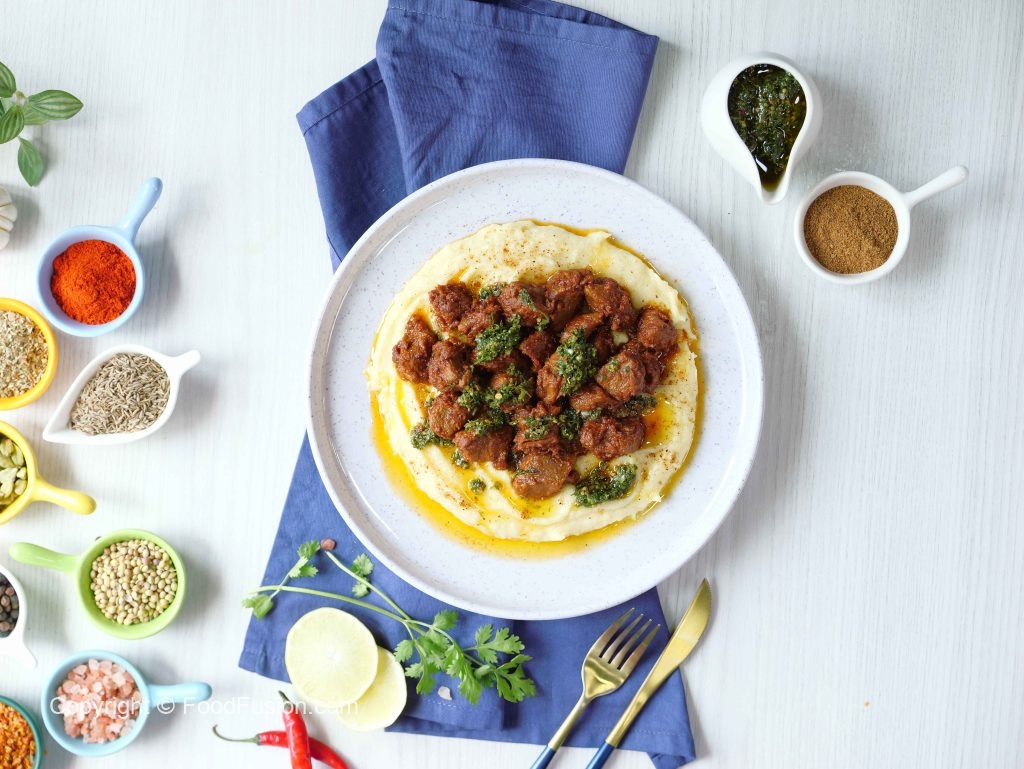 -Serving dish mein mashed potato,chimichurri sauce,fry beef boti,chimichurri sauce aur chaat masala dal ker serve karein.