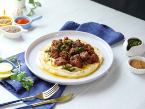 -In a serving dish,add mashed potato,chimichurri sauce,fry beef boti,chimichurri sauce,chaat masala & serve!