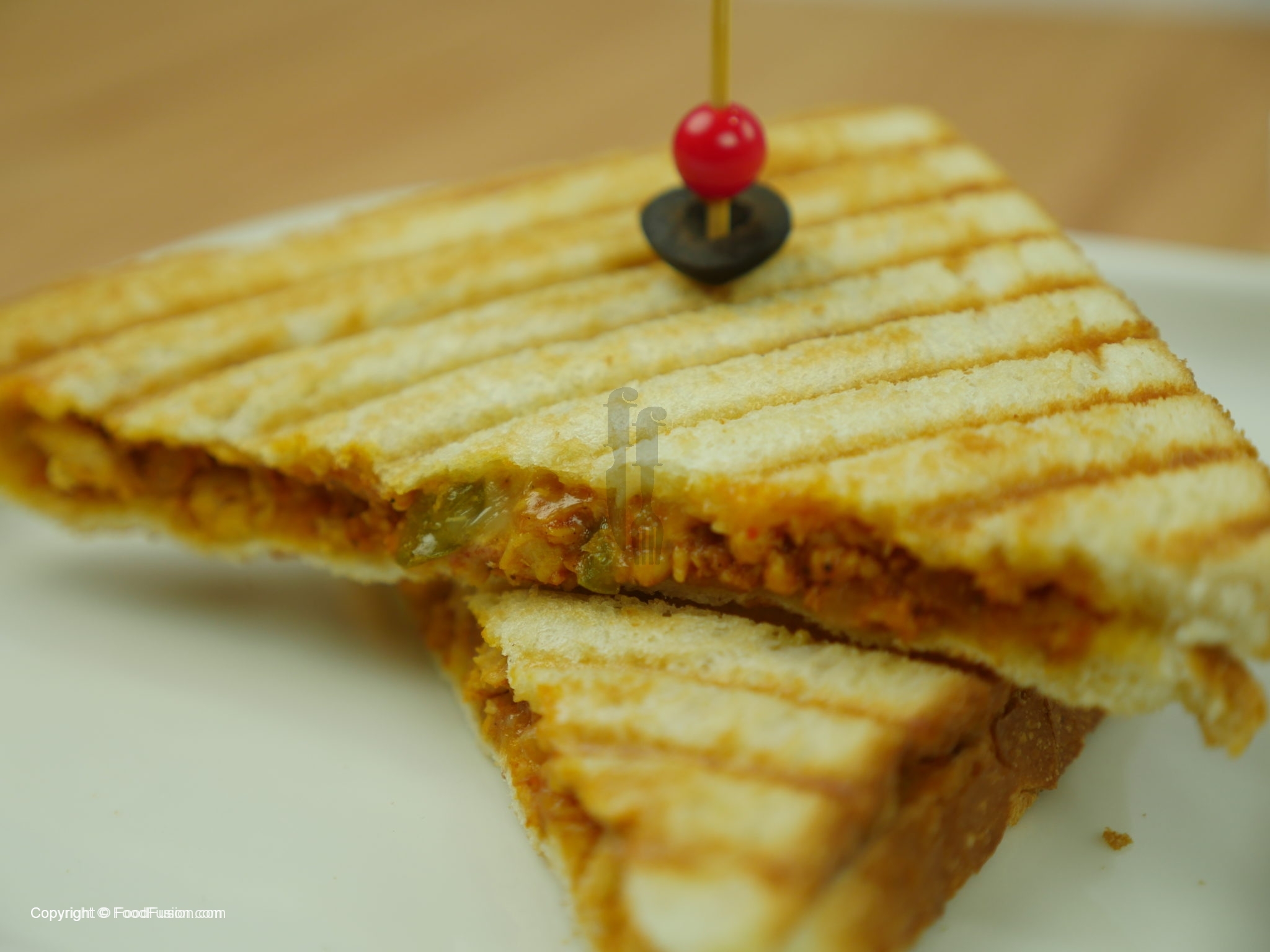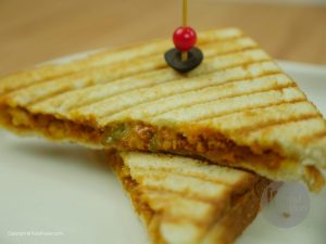 Grease grill pan with butter,place bread slice,add filling and cheddar cheese,cover with another bread slice,spread butter and grill the sandwich until golden brown and cheese is melted.