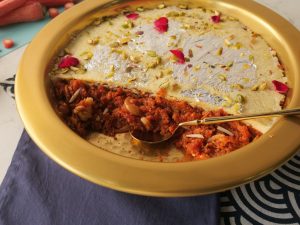 -In a serving dish,add gajar ka halwa,khoya and spread evenly.