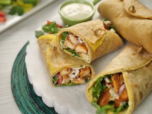 -Transfer it to a flat surface,add salad leaves,cooked chicken,onion,tomato,greek yogurt sauce & wrap it (makes 2-3).