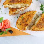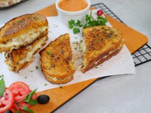 -Ek bread slice per cheddar cheese slices,mozzarella cheese,tayyar beef filling aur mozzarella cheese dal ker dosra bread slice rakh dein.