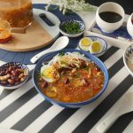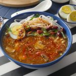 Serving bowl mein rice noodles,hot and sour soup,fried mong phali,hara pyaz leaves,boiled anda,chilli oil aur hara pyaz leaves dal ker serve karein!