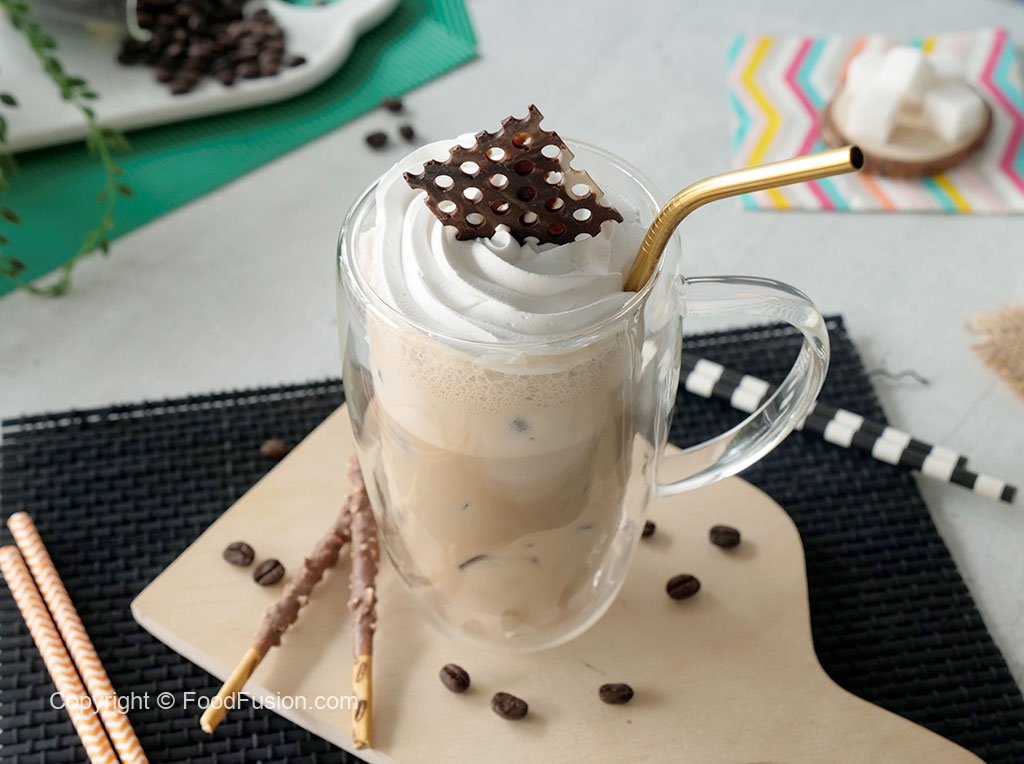 Blender jug mein doodh,Instant coffee,condensed milk,vanilla essence aur ice cream scoops dal ker ache tarhan blend ker lein.