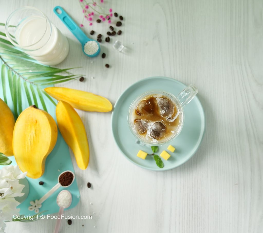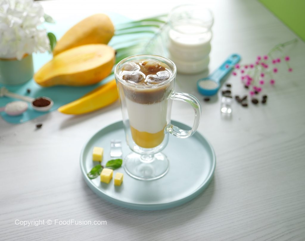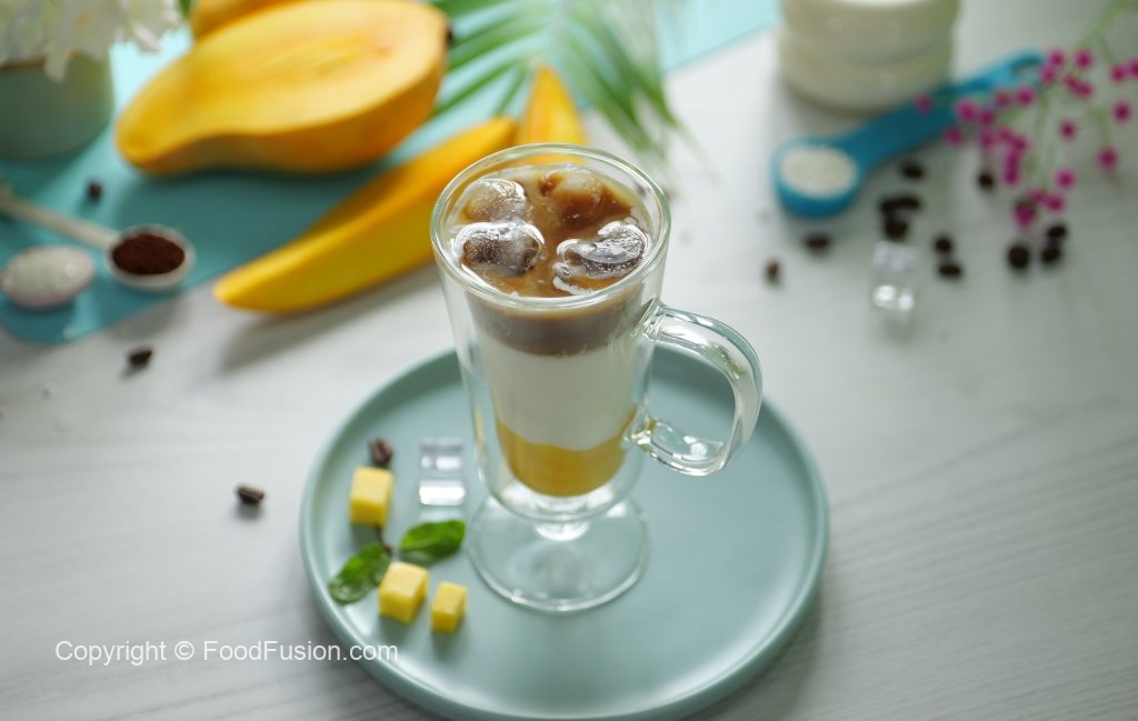-In a glass,add mango puree (2-3 tbs),ice cubes,prepared milk mixture (1/2 Cup),dissolved coffee (2 tbs),mix well & serve!