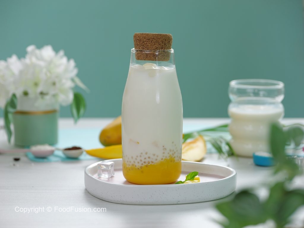 -Glass bottle mein tayyar mango puree (2-3 tbs),boiled sagudana (2 tbs),condensed milk mango chunks,ice cubes aur doodh dal ker stir ker lein & serve karein!