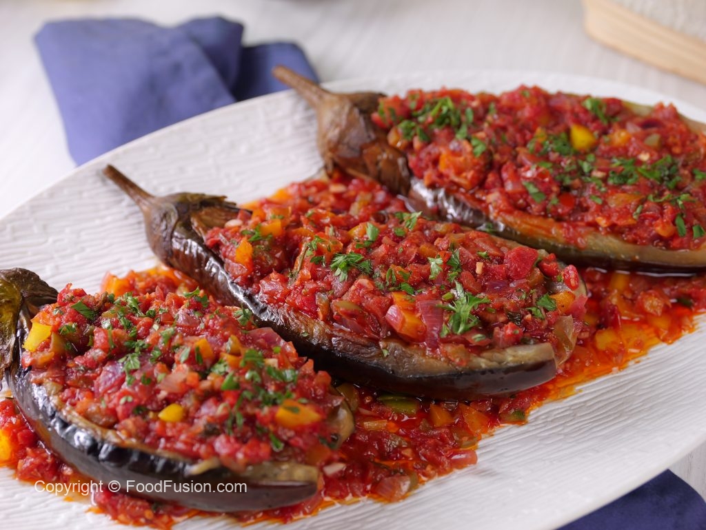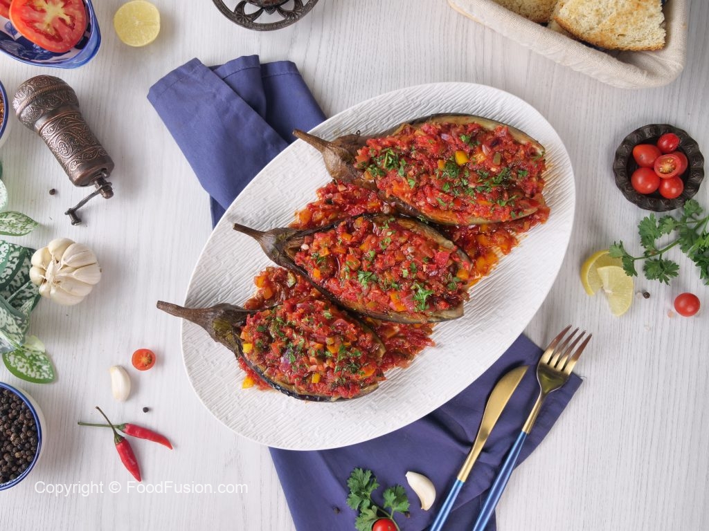 Turkish delight on a plate—tender roasted eggplant brimming with a savory filling of tomatoes, onions, and fragrant herbs. This timeless Turkish dish brings vibrant flavors right to your table. #happycookingtoyou #foodfusion #araywahh