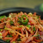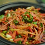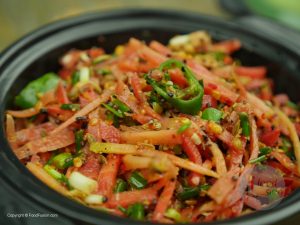 In bowl,add oil,nigella seeds(crushed),mustard seeds (crushed),coriander seeds(crushed),salt,red chili flakes,fennel seeds (crushed),tarti,garlic paste,green garlic,green chili and carrots.
