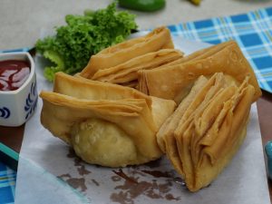 Add 1 tbs of prepared potato filling in the center,apply water,fold the sides of the dough over the filling and gently press the edges together to seal the suffering insides (makes 12).