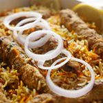 Ab dissolve zarda ka rang,fried pyaz aur cooked seekh kabab dal dein.