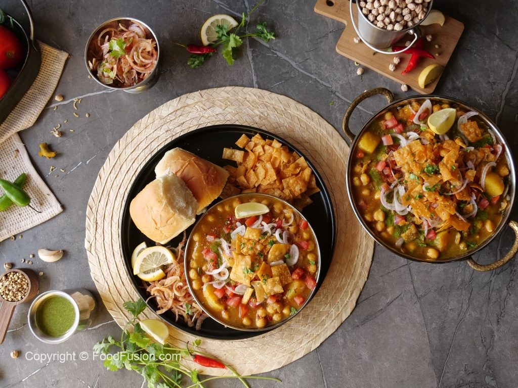 -Serving plate mein khathiawari choley,tayyar hari chutney,tamatar,chaat masala,lal mirch crushed, pyaz,papri aur hara dhania dal dein aur pav buns ka saath serve karein!