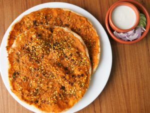 Spread prepared paste,sprinkle dried pomegranate seeds and green gram.