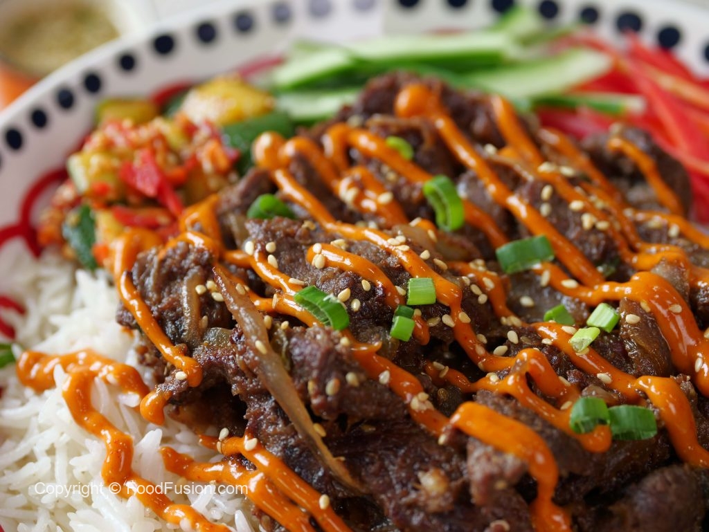 -Ek serving bowl mein cooked rice dalen, upar se beef bulgogi, steamed spinach, stir fried shiitake mushrooms, carrots, cucumber aur kimchi rakhen.