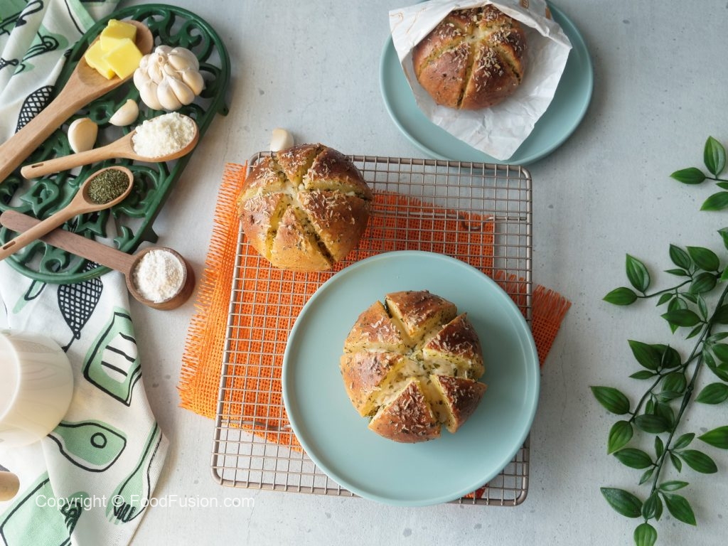 After the bread has been cut,pipe a rope of cream cheese filling in between each wedge and dip the entire bread into prepared garlic butter mixture.