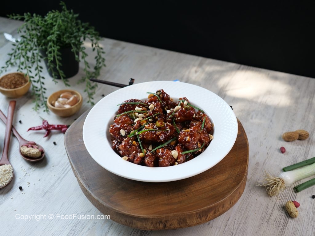 -In a wok,heat cooking oil & fry chicken until light golden,take out chicken pieces & let it rest for a minute & fry again until crispy & set aside.
