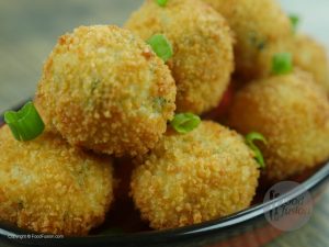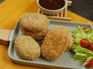 On your palm,add potato mixture,place chicken marinated cube and cover with potato mixture.