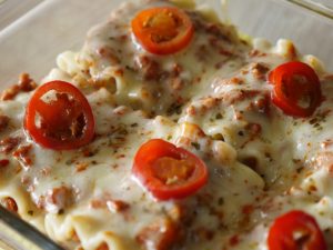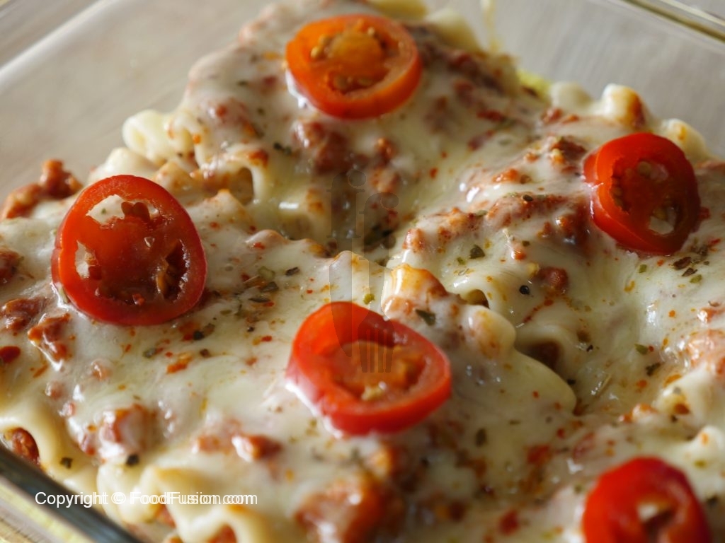 Baking dish mein red sauce with mince dal ker pheela lein.