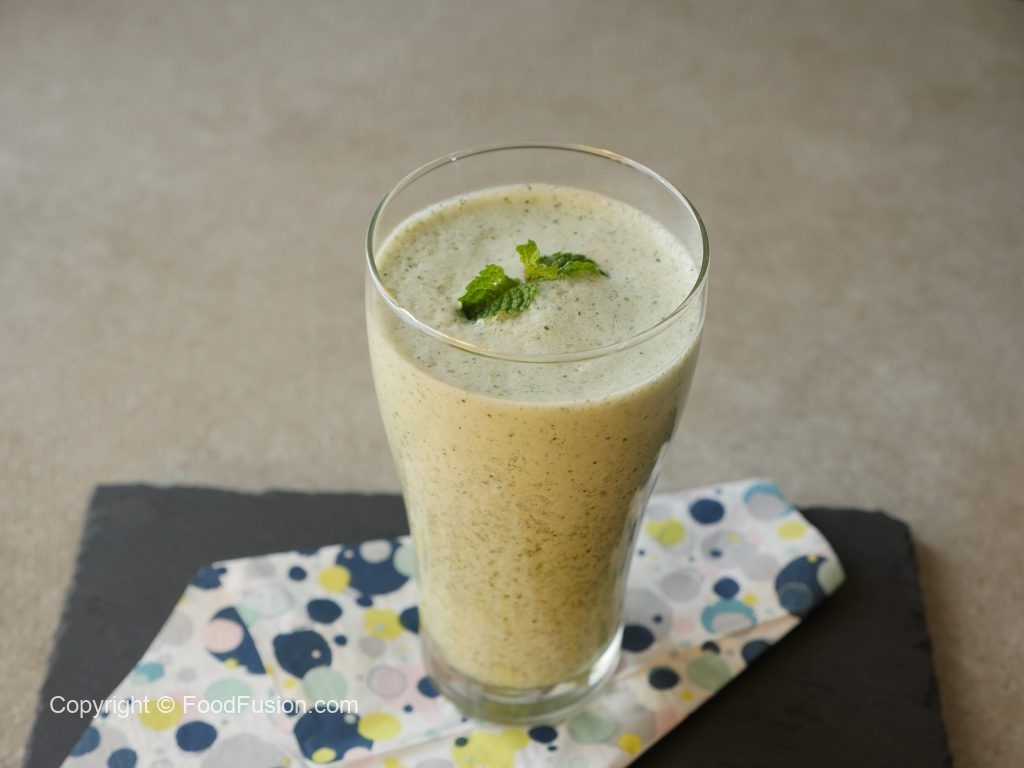 In grinder,add yogurt,mint leaves,cumin seeds,salt,ice cubes,milk,honey and blend until well combined.