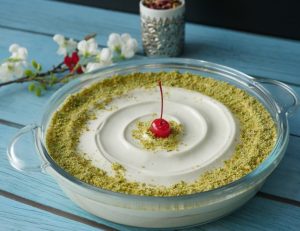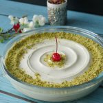 Serving dish mein tayyar cream ki layer dal ker evenly pheela lein.