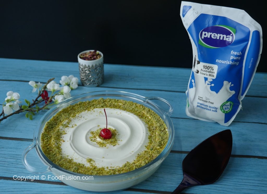 Bowl mein cream,powdered cheeni aur vanill essence dal dein aur fluffy hunay tak beat ker lein.