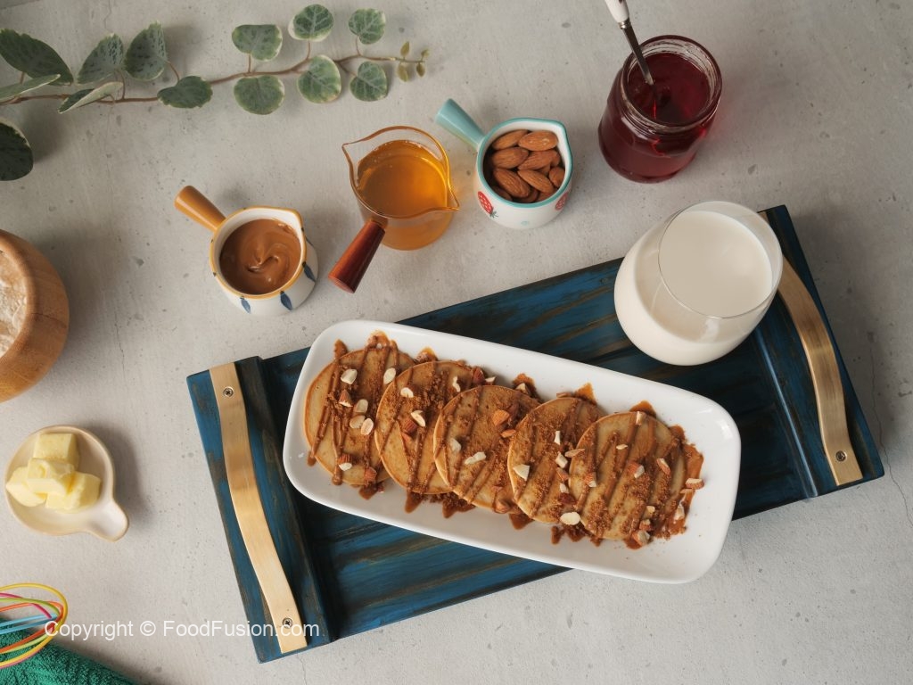 On serving plate,place lotus pancakes,drizzle lotus spread,sprinkle crushed caramel biscuit,almonds & serve!