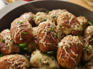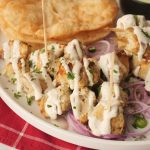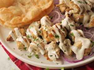 -Drizzle creamy garlic sauce over malai tikka bites,sprinkle fresh coriander & serve with puri paratha, green chutney & onion rings.