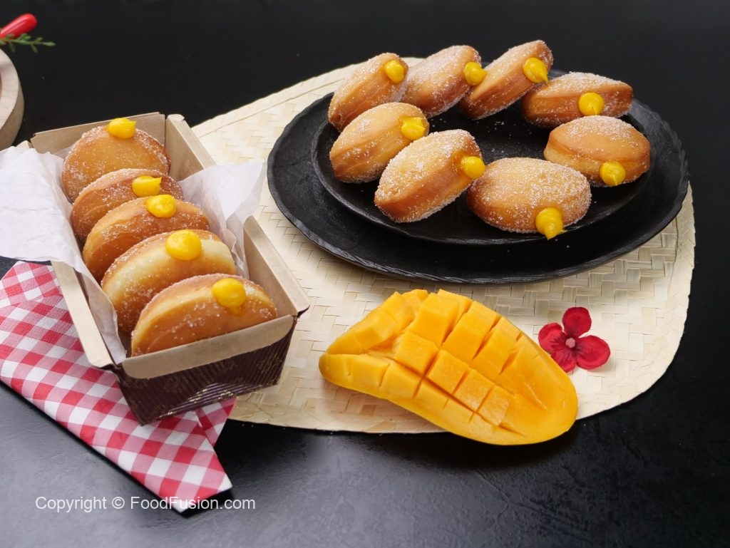 -Fit a piping bag,fill with prepared mango curd into each donut & serve! (Makes 10-12)