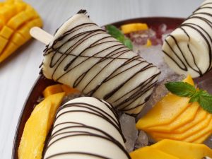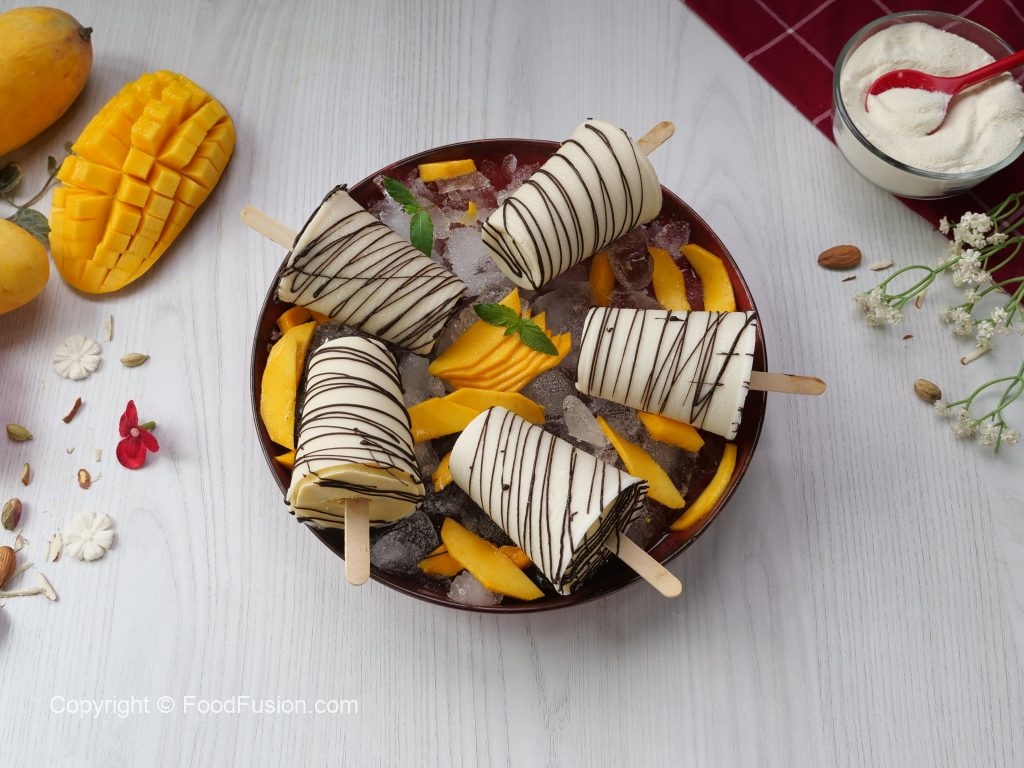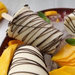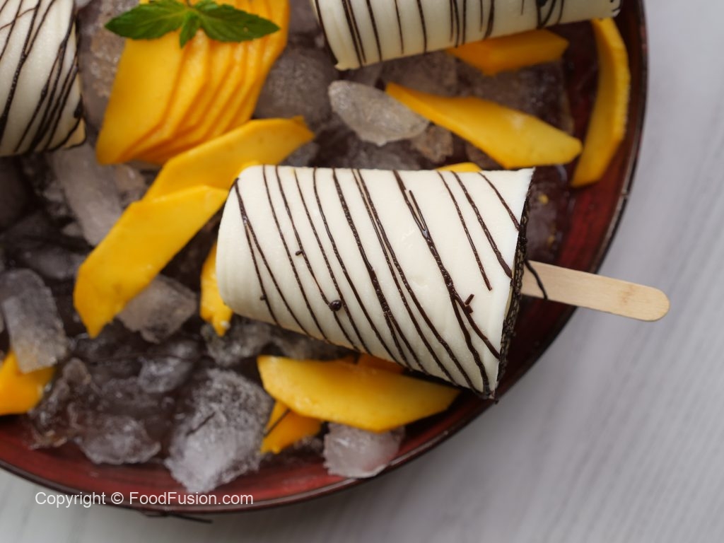 -Pour melted white chocolate in plastic disposable cups/Kulfi molds & tilt the cup to spread inside evenly then remove excess & let it set in refrigerator for 15 minutes then repeat chocolate coating,remove excess & refrigerate until set.