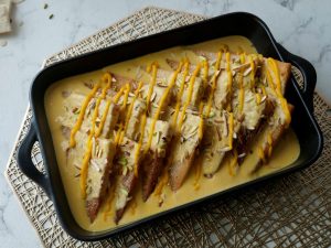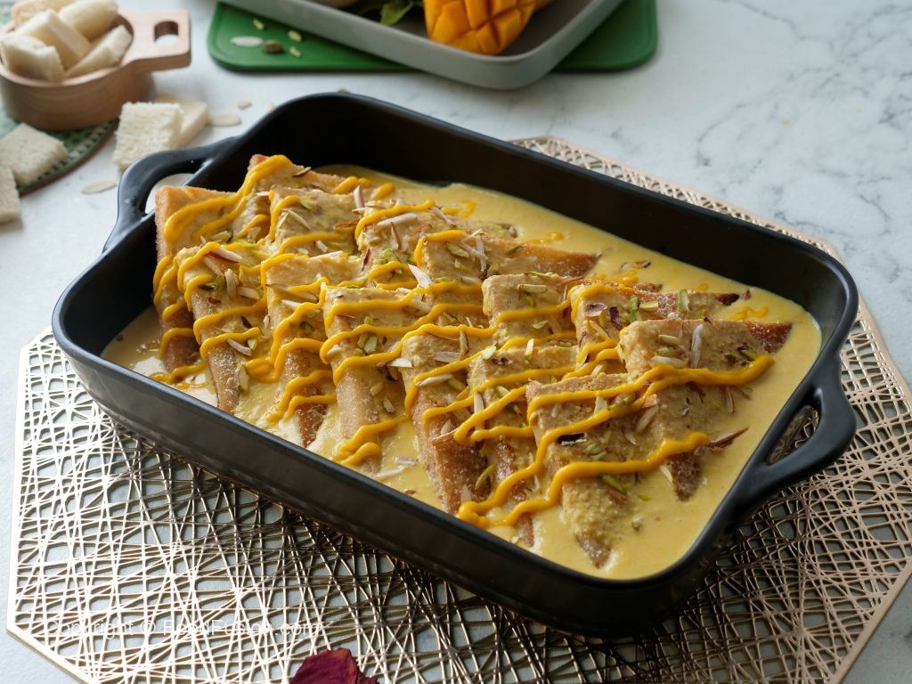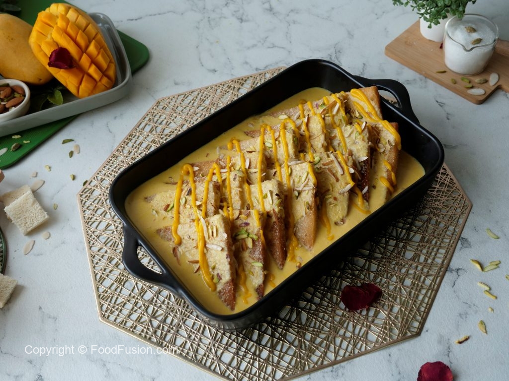 Serving dish mein bread slices rakhd ein,khopra,tayyar mango milk syrup,pista,badam aur tayyar mango & cream sauce dal dein aur thanda serve karein!