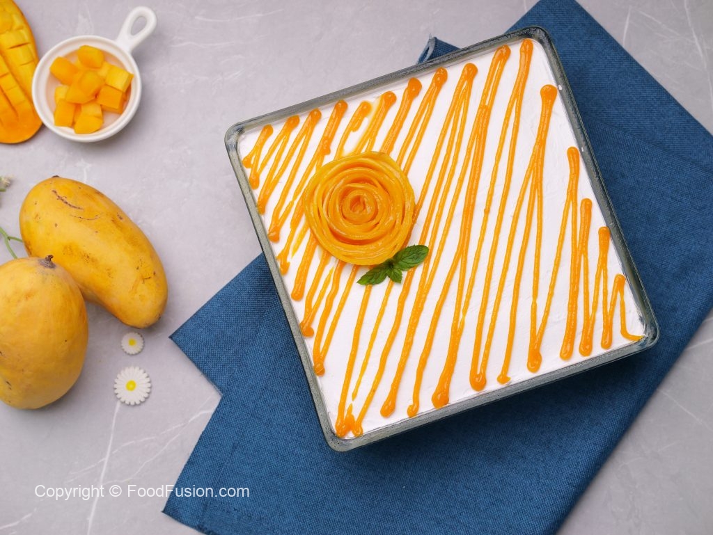 -Poke holes with the help of fork or skewer,pour prepared mango milk syrup & let it absorb completely (add more syrup if required).