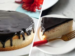 -Knife ki madad sa cake ko do horizontal layers mein cut ker lein.