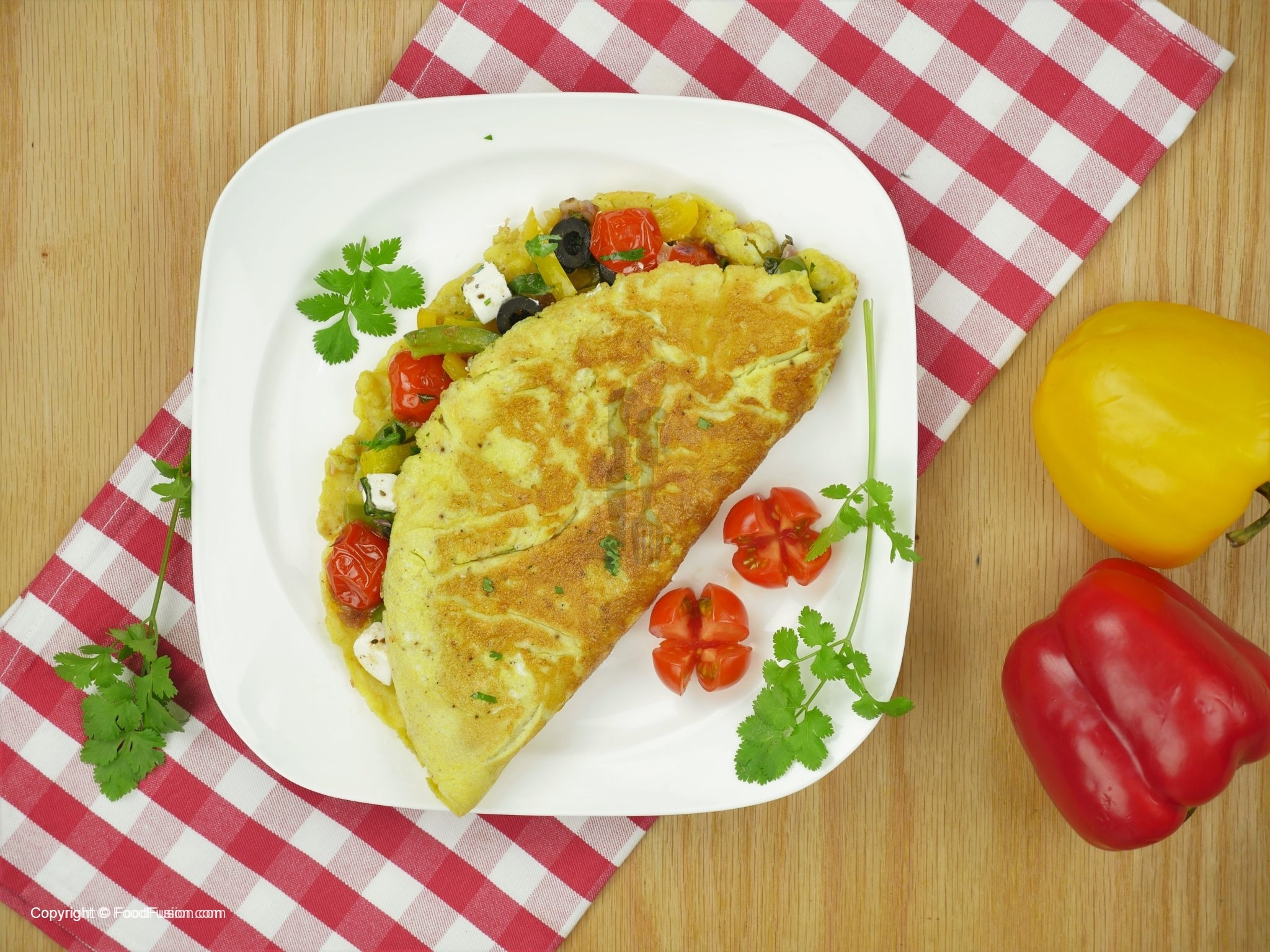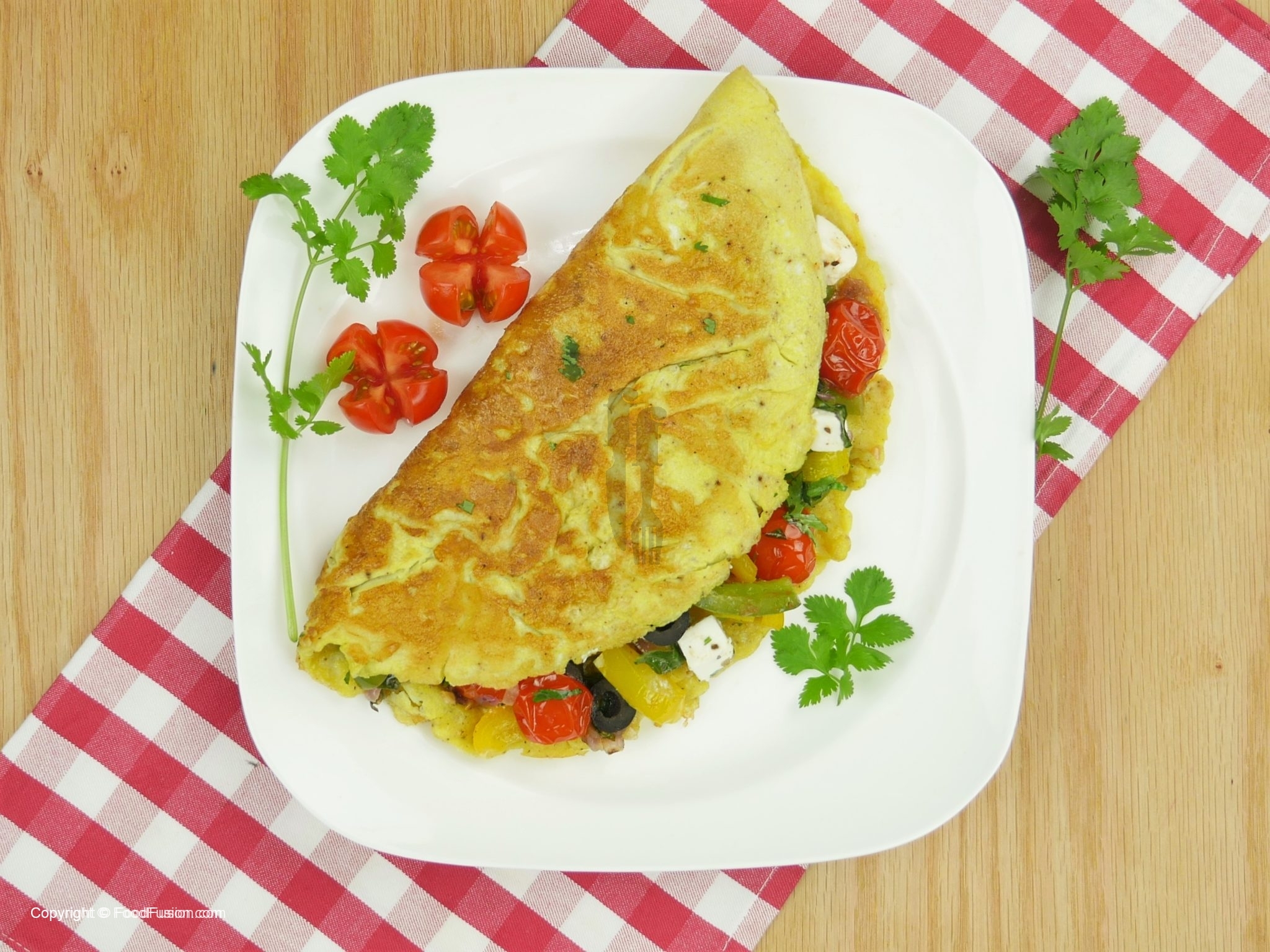 Sprinkle dried oregano and fill stir fried vegetable over half of each omelette.