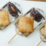 Take samosa sheet and cut into four equal parts/strips,place one samosa patti/strip horizontally,apply all-purpose flour paste,place skewer/stick then place second samosa patti vertically over first one,it will make plus (+) sign.