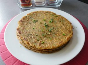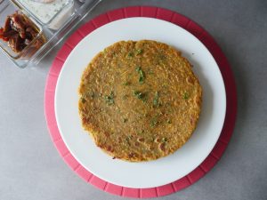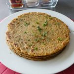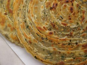Knead dough again,take a small dough,grease hands with oil and make a ball,sprinkle dry flour,add & spread cooking oil and roll out with the help of rolling pin.
