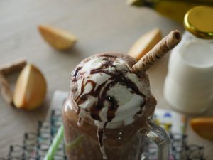 Serving jar mein chocolate syrup,tayyar smoothie,ice cream dal dein aur chocolate sa garnish ker ka chilled serve karein.