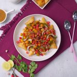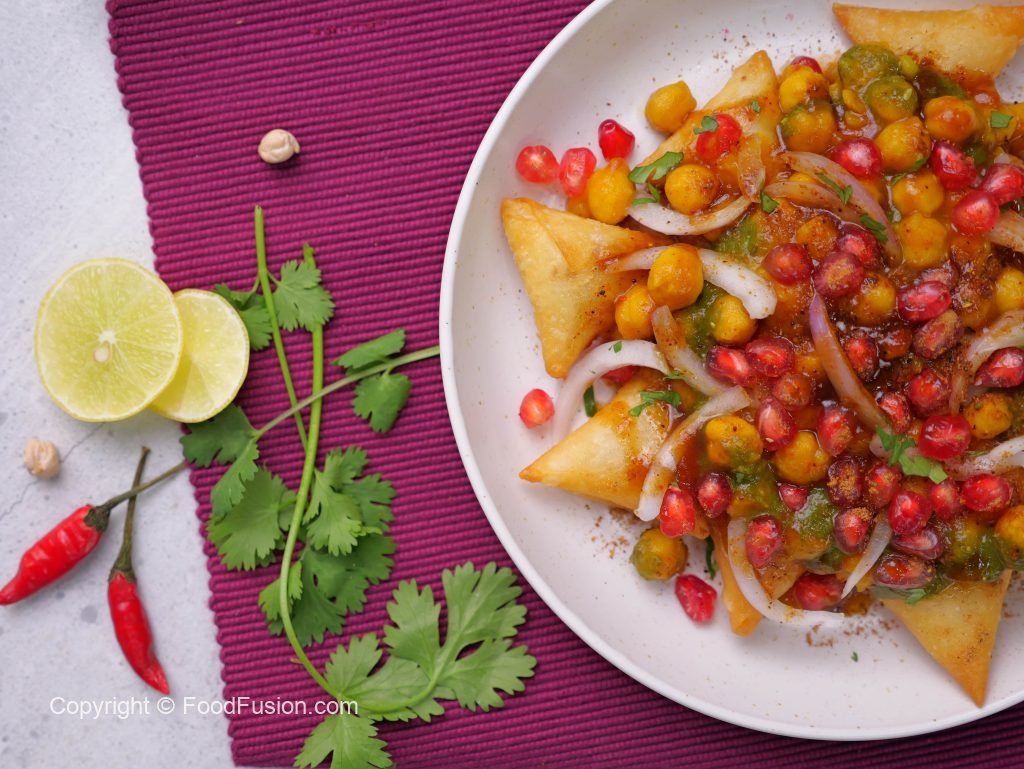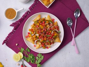 -In a serving plate,add mini aloo samosa,cooked chickpeas,lemon juice,gur imli ki chutney,green chutney,onion,pomegranate,chaat masala,fresh coriander & serve!