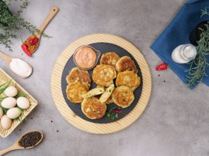 -In a frying pan,heat cooking oil,pipe out prepared mixture & flatten with the help of greased spoon & fry pancakes from both sides on low flame until golden brown.