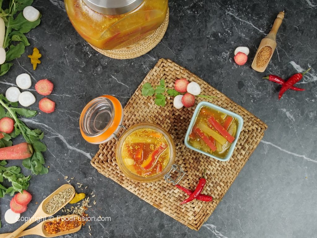 -Bowl mein blanched vegetables,namak,lal mirch crushed,haldi powder,coarsely crushed saunf & raidana aur sirka dal ker ache tarhan mix karein aur dhak ker overnight kliya room temperature per chor dein.