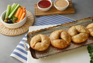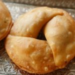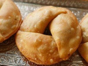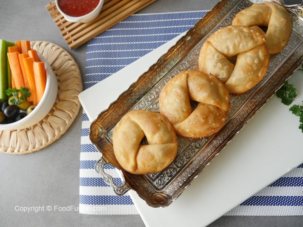 Take three small dough,add prepared chicken filling,prepared potato filling,prepared mozzarella cheese,apply water,fold & seal properly.