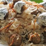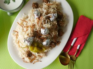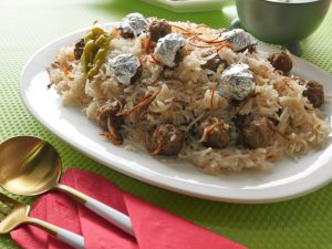 On serving plate,add cooked rice,fried onion,fried meat balls & serve.