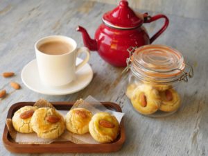 Baking plate/tray per butter paper laga lein aur nan khatai balls rakh dein,ande ki zardi aur roasted badam laga lein.