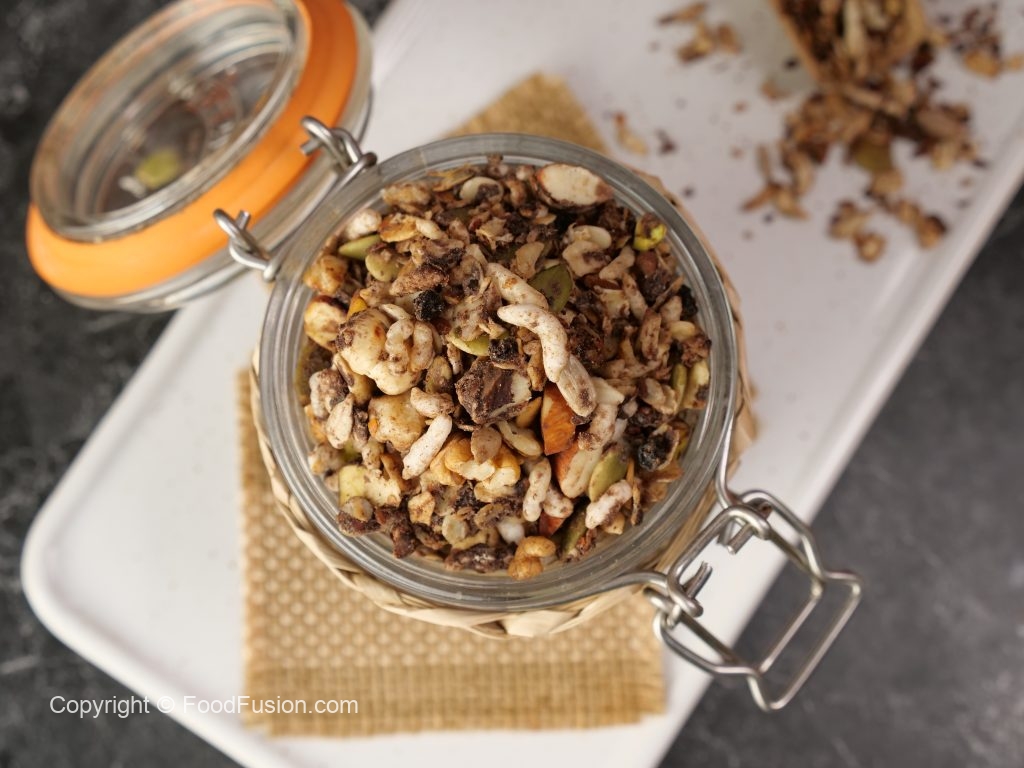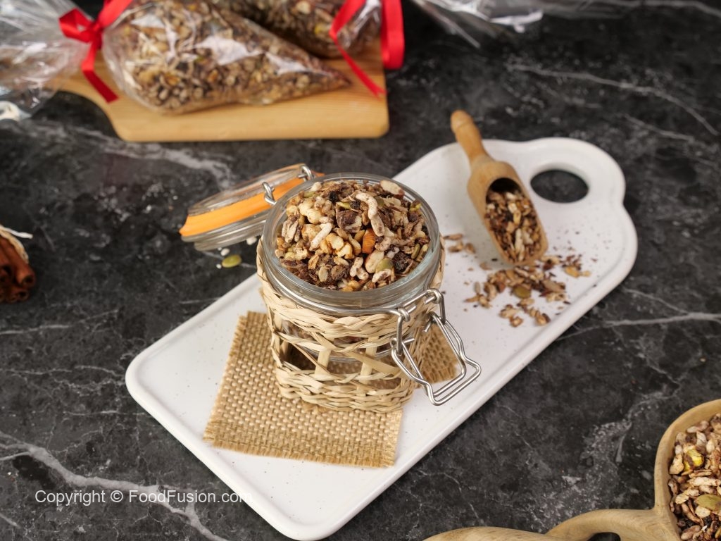 -Let it cool completely & mix well (yields: 1000g of granola).