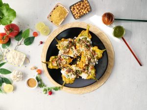 -Assemble fried palak patta on a platter,add chickpeas,bareek boondi,tomato,onion,yogurt,khatti meethi chutney,green chutney,sprinkle chaat masala,nimco sev & fresh coriander & serve!